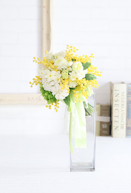 ◆ 幸せのオーラを放つ鮮やかな黄色のミモザとピュアな白いお花を束ねた愛らしいクラッチブーケ♪