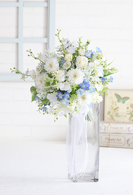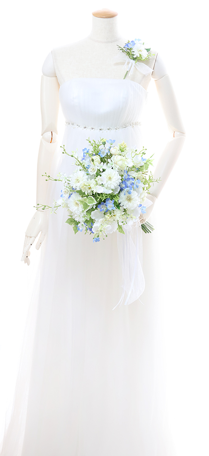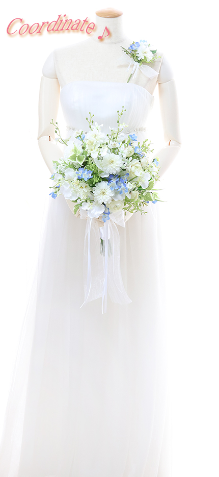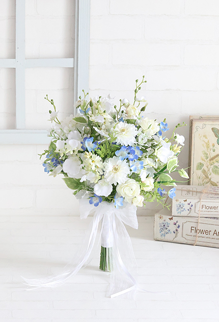 ◆ 様々なフォルムの白花に幸せのサムシングブルーの小花を散りばめたナチュラルで爽やかなクラッチブーケ♪