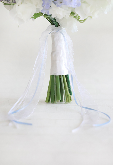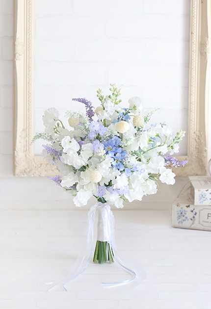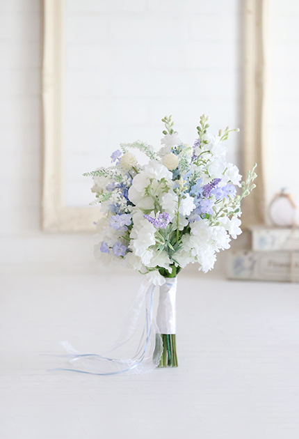 ◆ 清楚な白花にアイシーカラーのお花を組み合わせた優しさと優雅さが溶け合うエアリーなクラッチブーケ♪
