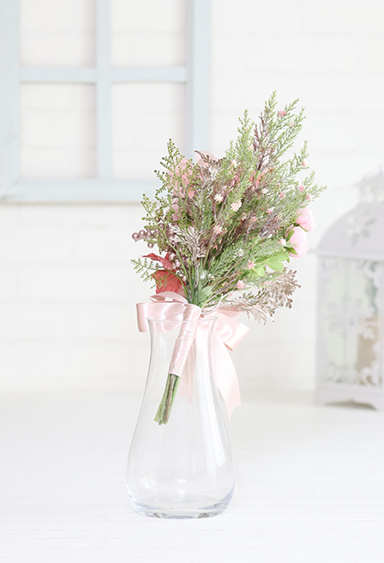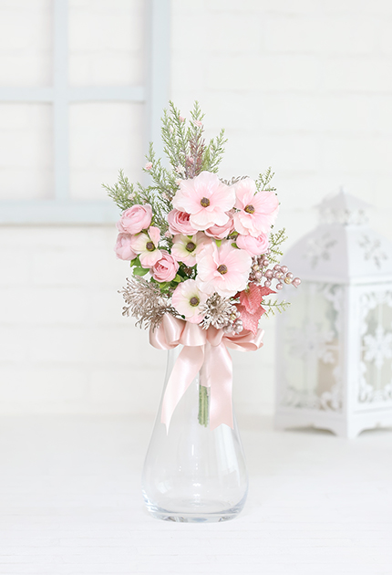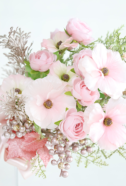 ◆ シュガーピンクのお花にグリッターリーフを合わせた甘く上品なステムブーケ♪ キラリと光るメタリックはクリスマスシーズンにもぴったりです!