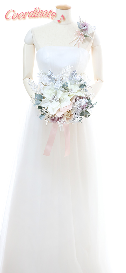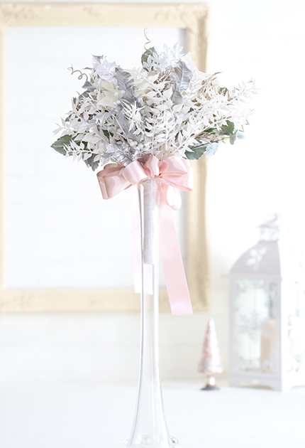 ◆ スノーホワイトのポインセチアに煌めくグリッター&メタリックリーフをあしらった甘く清らかなホーリーブーケ♪ 少し重め!
