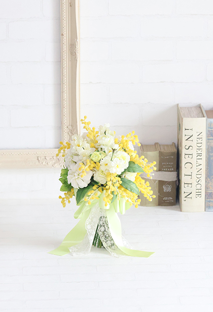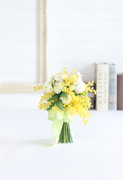 ◆ 幸せのオーラを放つ鮮やかな黄色のミモザとピュアな白いお花を束ねた愛らしいクラッチブーケ♪
