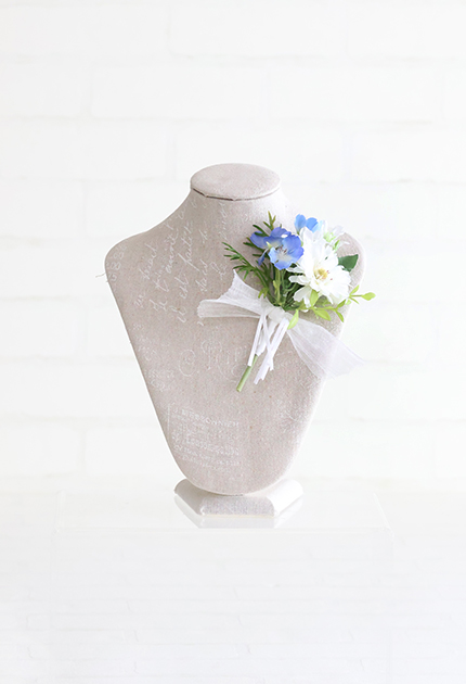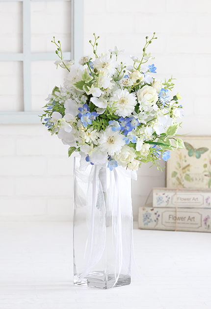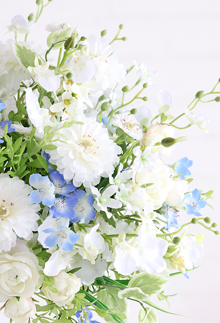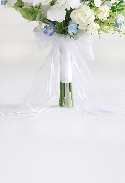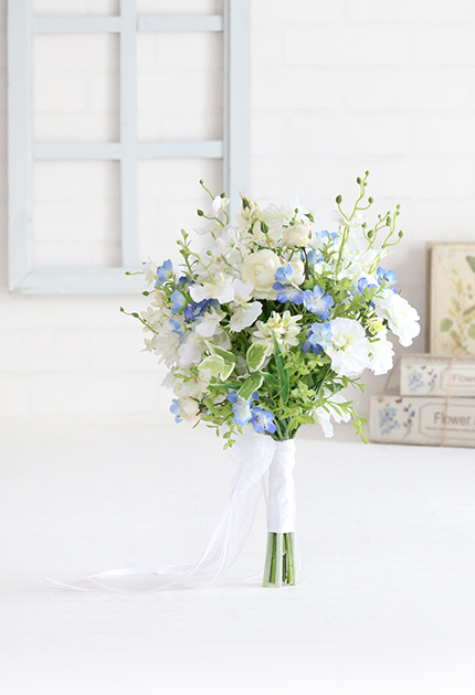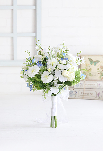 ◆ 様々なフォルムの白花に幸せのサムシングブルーの小花を散りばめたナチュラルで爽やかなクラッチブーケ♪