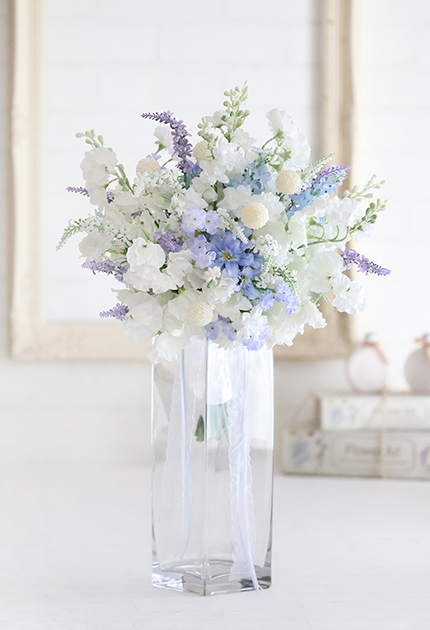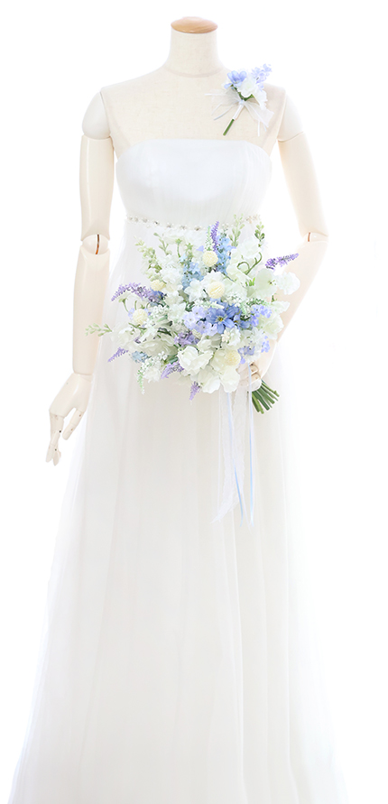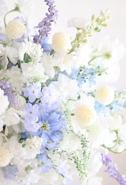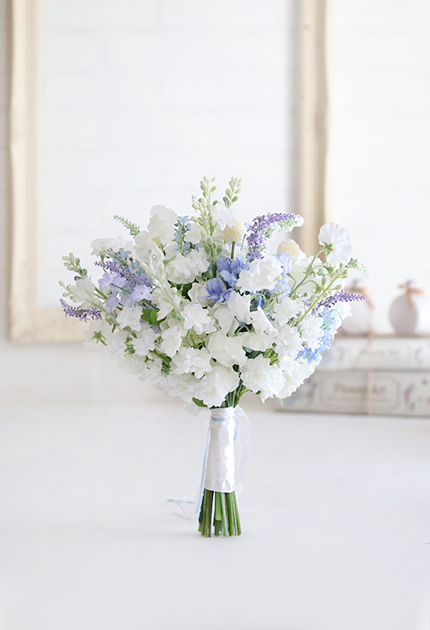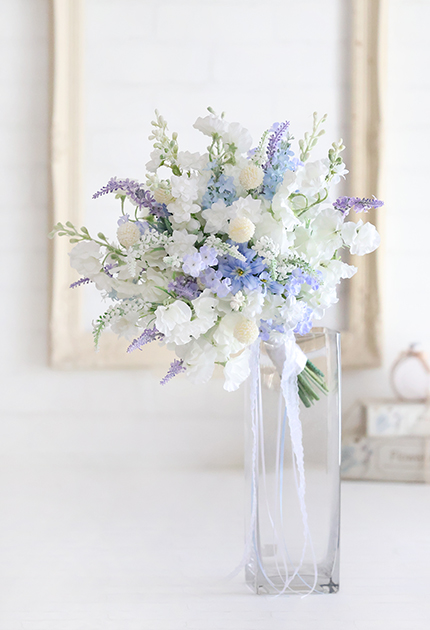 ◆ 清楚な白花にアイシーカラーのお花を組み合わせた優しさと優雅さが溶け合うエアリーなクラッチブーケ♪