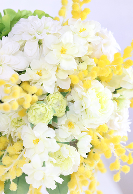 ◆ 幸せのオーラを放つ鮮やかな黄色のミモザとピュアな白いお花を束ねた愛らしいクラッチブーケ。
