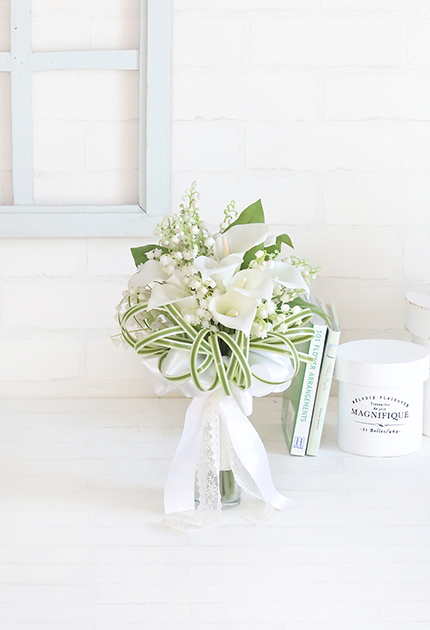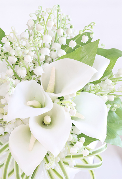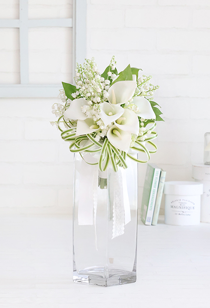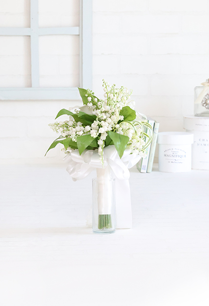 ◆ スタイリッシュなカラーとふっくら丸い小鈴のようなスズランを束ね、グリーンで立体感をプラスしたお洒落なブーケ。