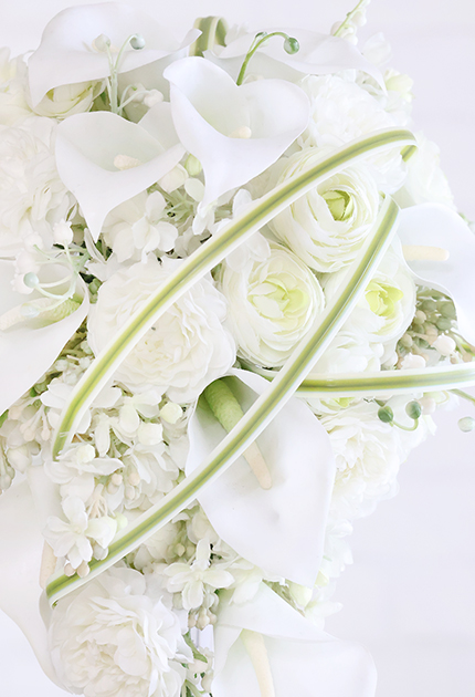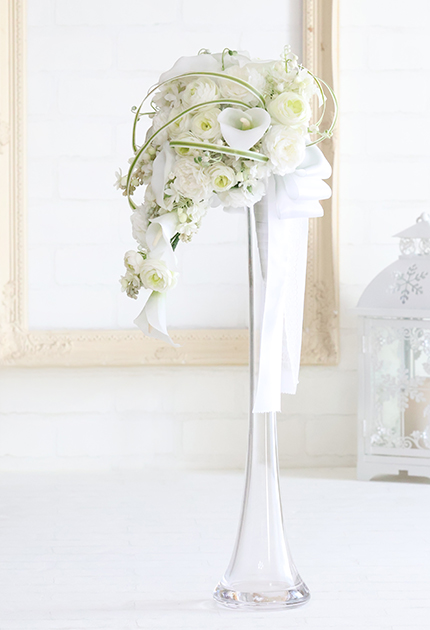◆ スタイリッシュなカラーを主役に、愛らしいお花を組み合わせた洗練キャスケードブーケ。
