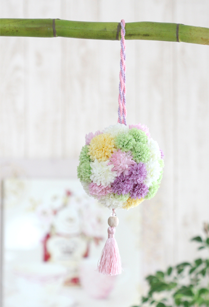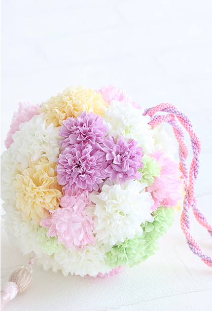 ◆ パステルカラーのピンポンマムでまぁるくこしらえた愛らしい手鞠ブーケ♪ ブーケをよ-く見ると模様がミッキーふうに♥