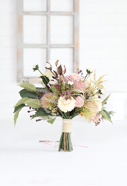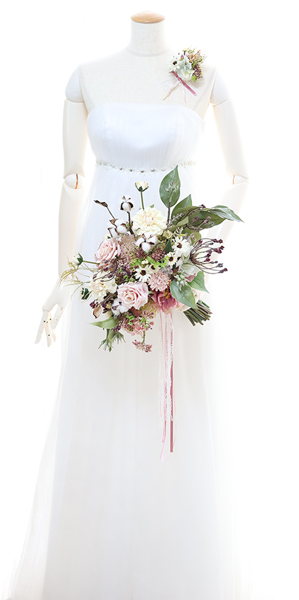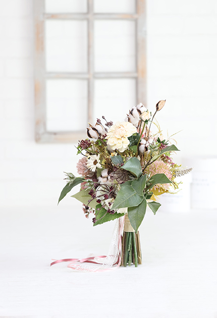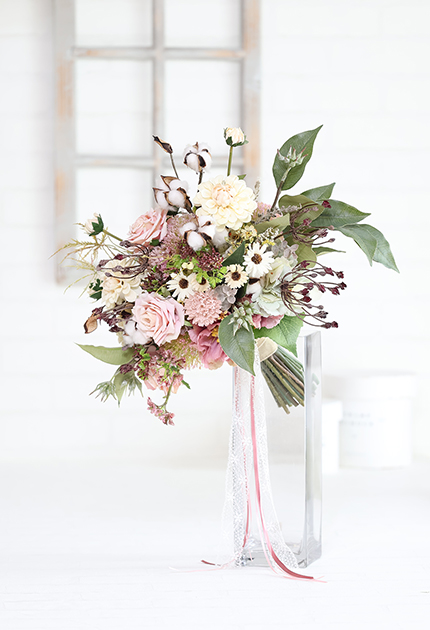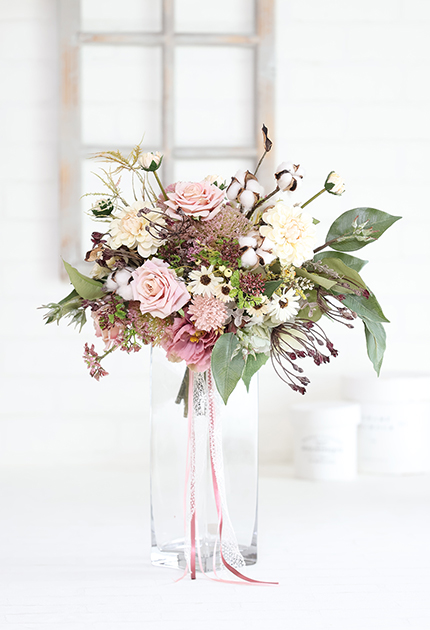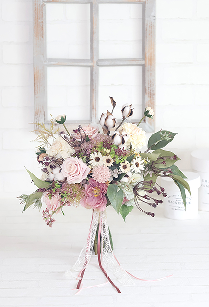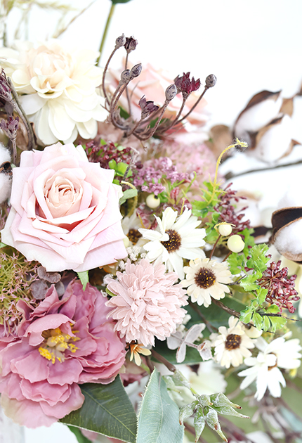 ◆ 使用花材:バラ、ダリア、シャクヤク、アジサイ、マム、ビバーナム アリウム、デージー、ユーカリ、コットンフラワー、シードクラウン