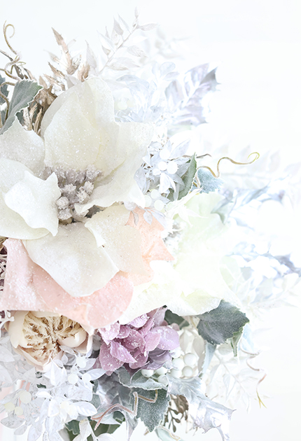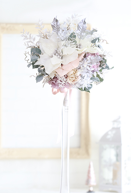◆ スノーホワイトのポインセチアに煌めくグリッター&メタリックリーフをあしらった甘く清らかなホーリーブーケ♪ 少し重め!