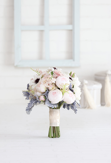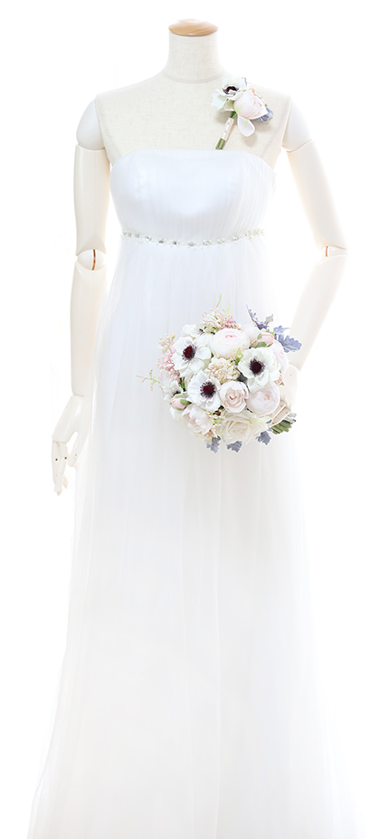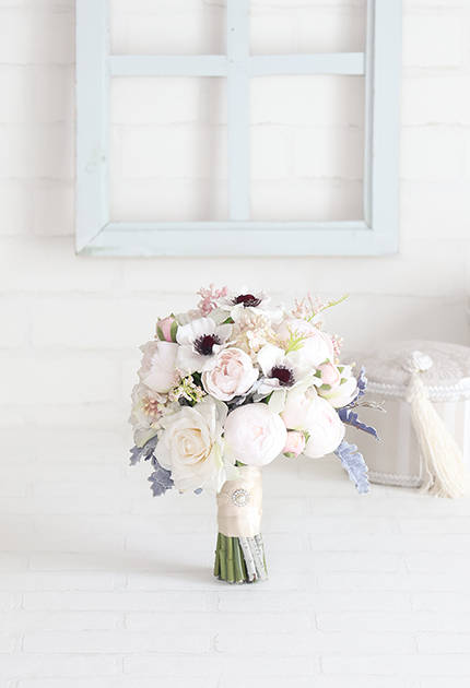 ◆ やわらかなトーンでまとめた白とピンクが奏でる大人ロマンティックなブーケ♪ フロントにワンポイントアクセ♪♪ ※ 少し重め!!
