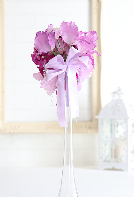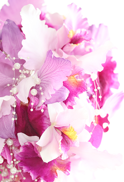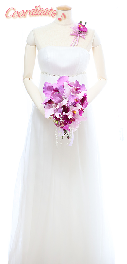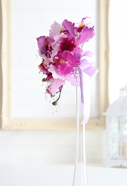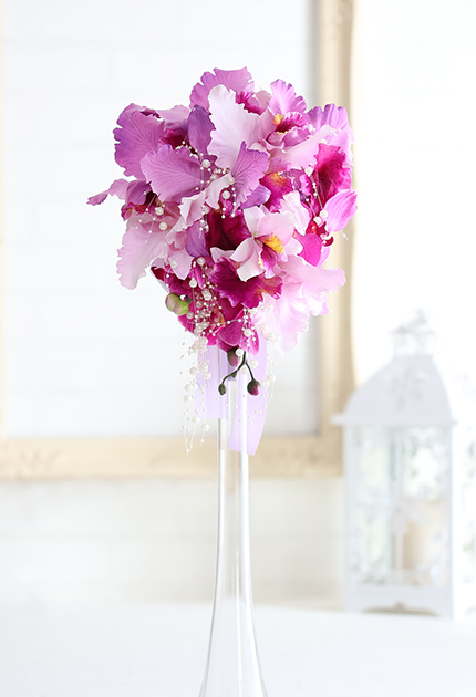 ◆ フリルの花びらと蝶のような花弁を持つ艶やかなパープル色のカトレアをシンプルに束ねたティアドロップブーケ♪ きらめきパールを施してゴージャス感アップ!