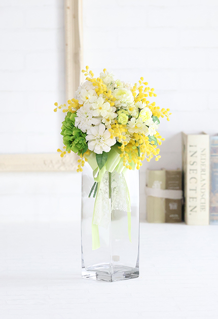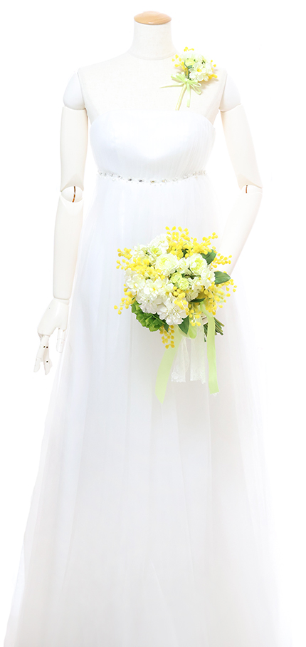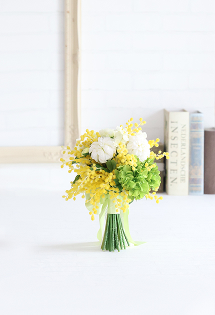 ◆ 幸せのオーラを放つ鮮やかな黄色のミモザとピュアな白いお花を束ねた愛らしいクラッチブーケ。