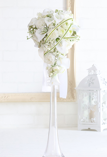 ◆ スタイリッシュなカラーを主役に、愛らしいお花を組み合わせた洗練キャスケードブーケ。