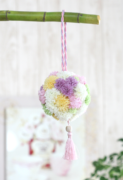 ◆ パステルカラーのピンポンマムでまぁるくこしらえた愛らしい手鞠ブーケ♪ ブーケをよ-く見ると模様がミッキーふうに♥