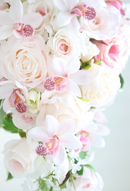 ◆ 使用花材:バラ、トルコキキョウ、シンビジュウム、カスミソウ、ハゴロモジャスミン